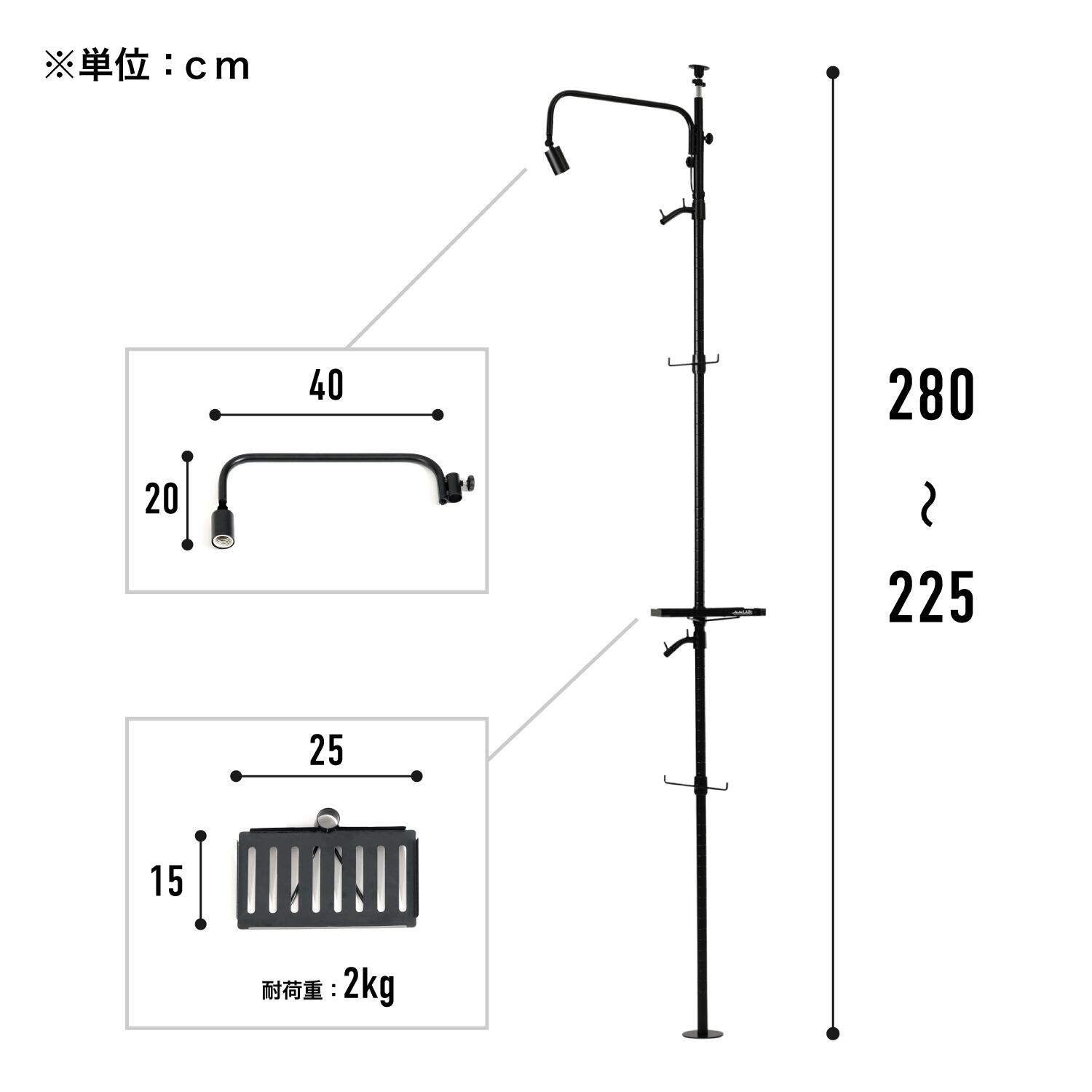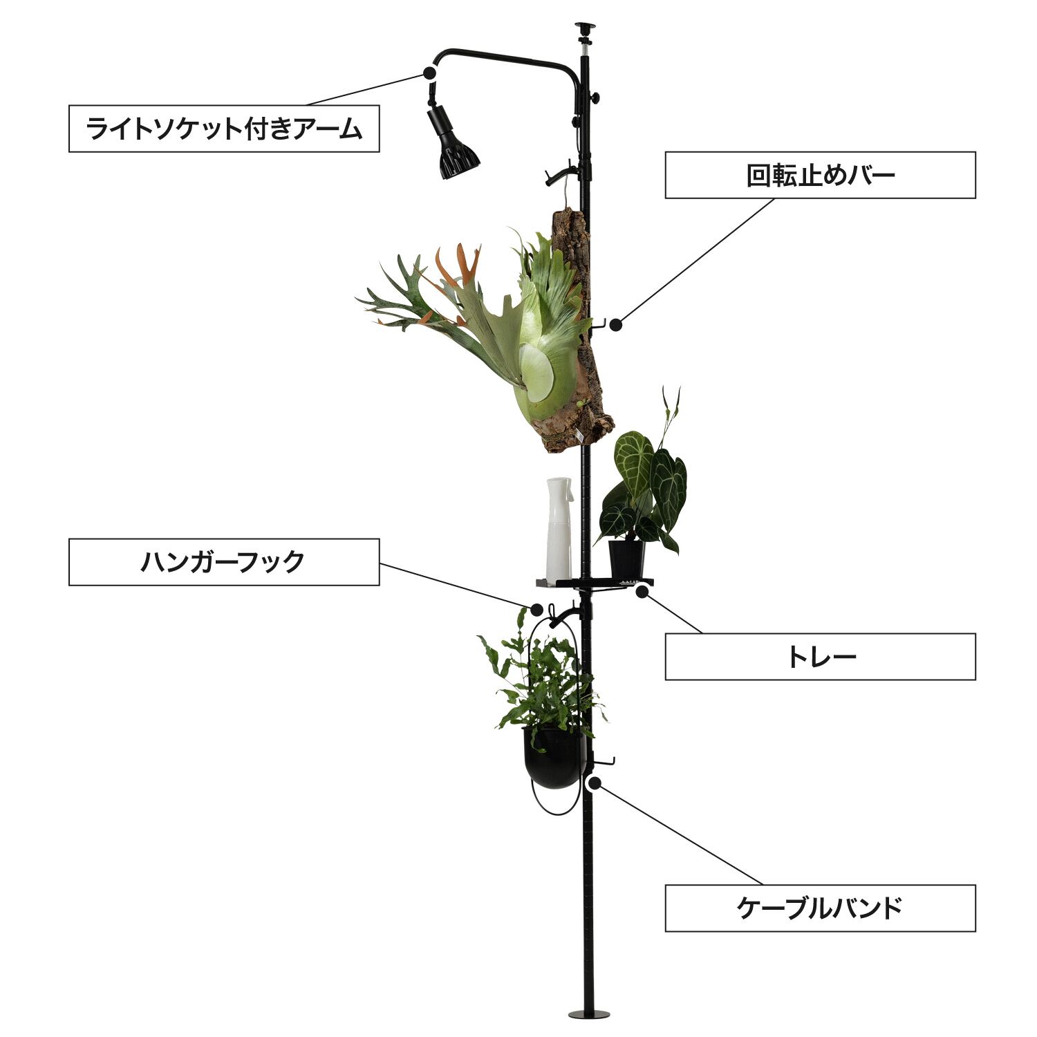 ・構成パーツ:ライトソケット付きアーム×1、ハンガーフック×2、回転止めバー×2、トレー×1、ケーブルバンド×5、ポール本体