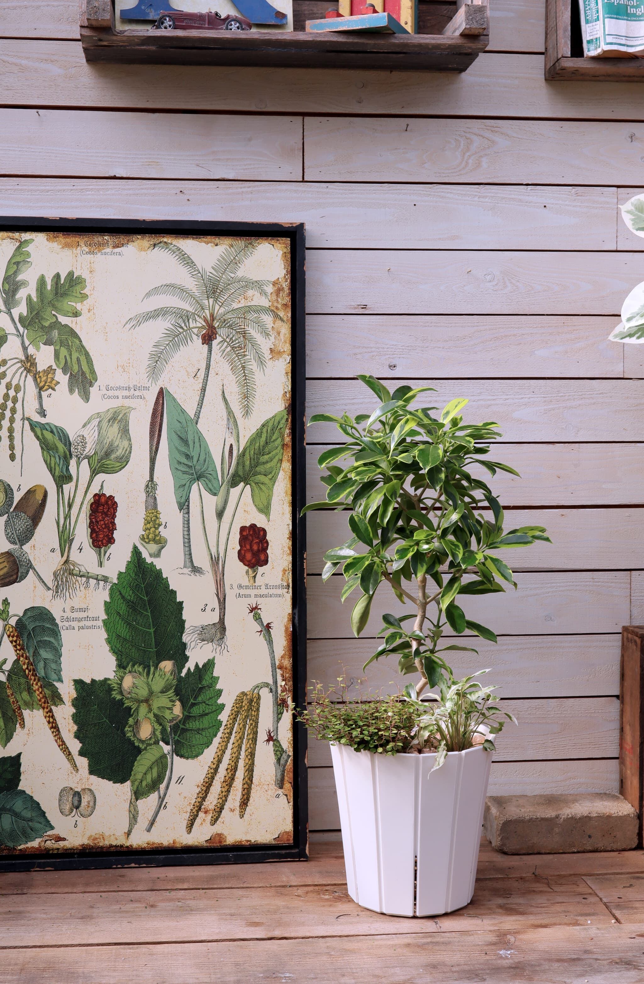 ●陶器鉢のような手触りと安定感のある寸胴型のフォルムで、観葉植物、多肉植物などをすっきり清潔に飾れます。