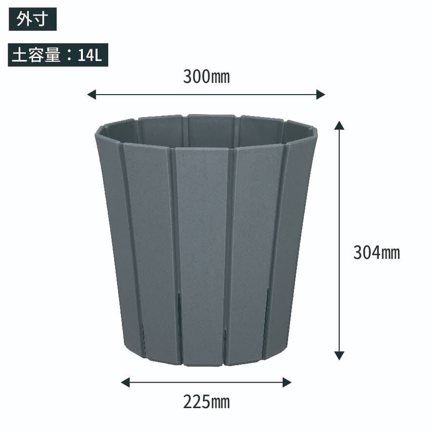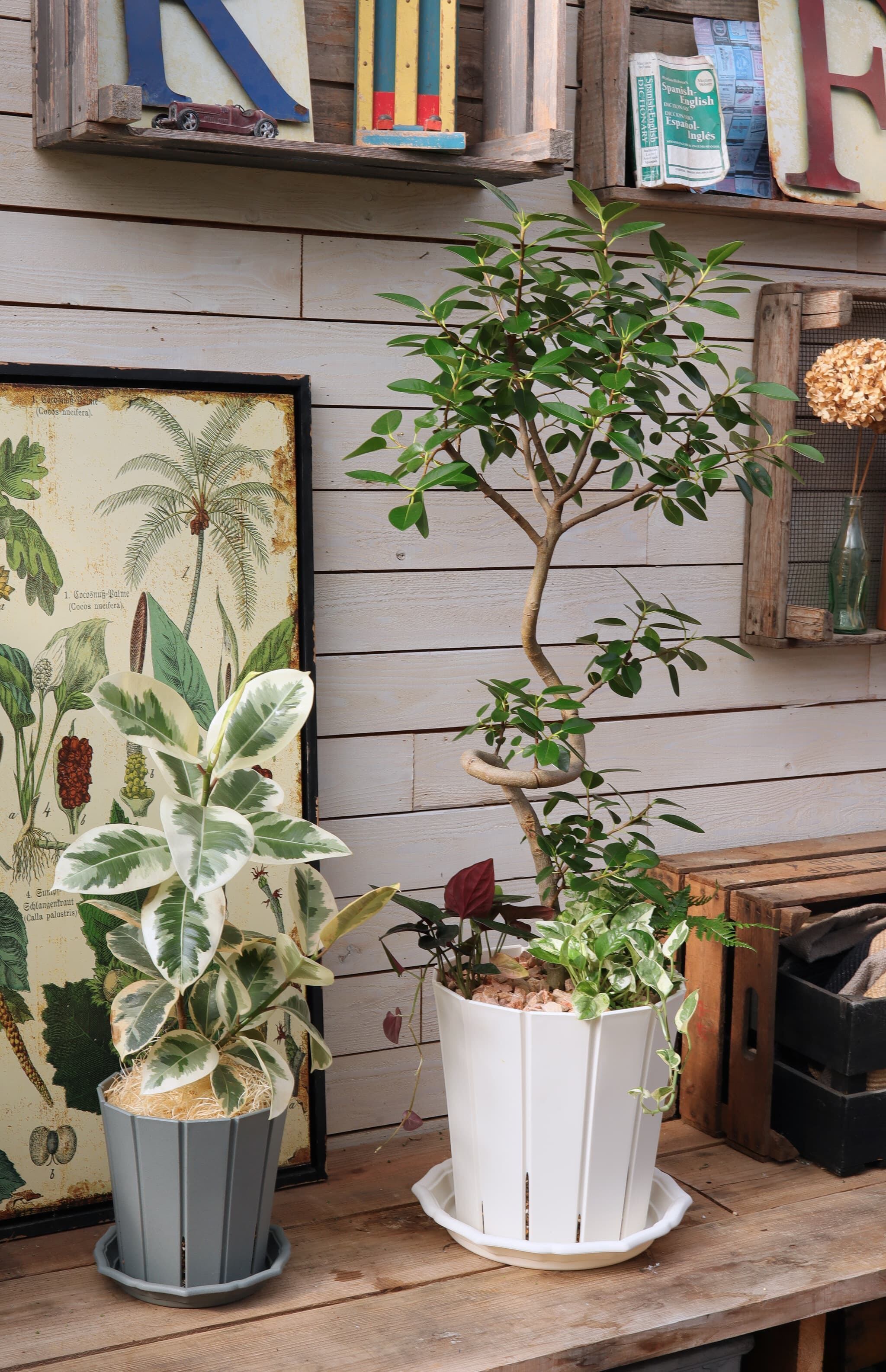 ●陶器鉢のような手触りと、安定感のある寸胴型のフォルムで、観葉植物、多肉植物などをすっきり清潔に飾れます。