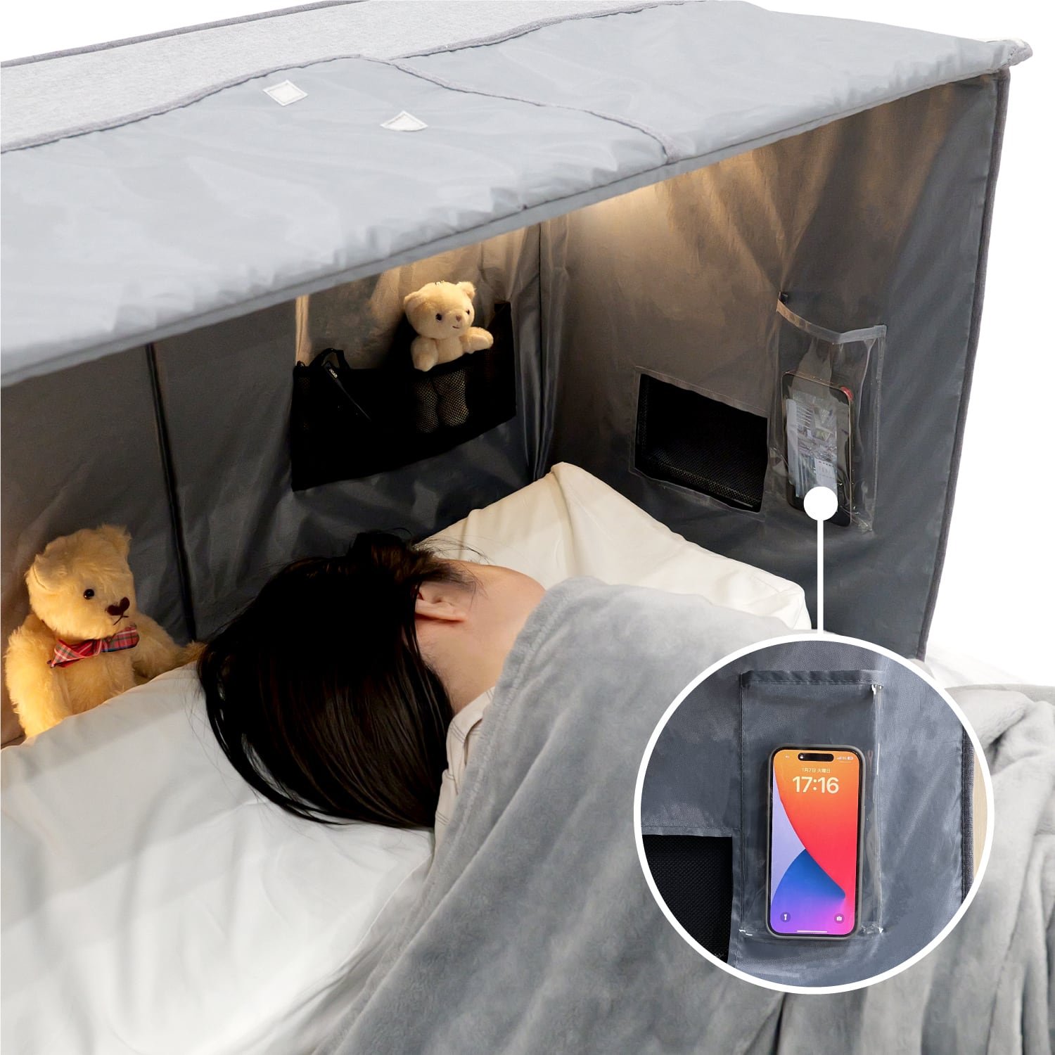 調光カーテン付きの安眠ドームが光の侵入を軽減し、部屋の環境や季節によって変化する日の出時間に左右されず、