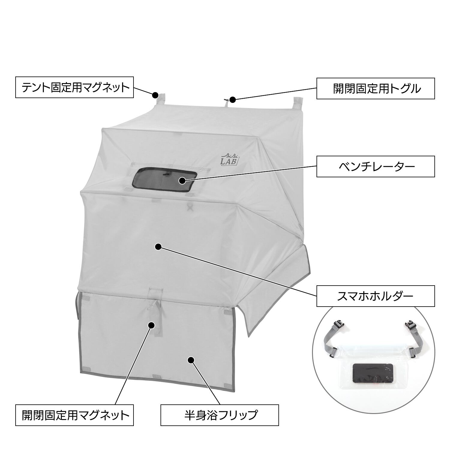・半身浴フラップを伸ばすことで、テント内の蒸気を効率よくとどめ、少なめのお湯で半身浴を楽しむことができます。