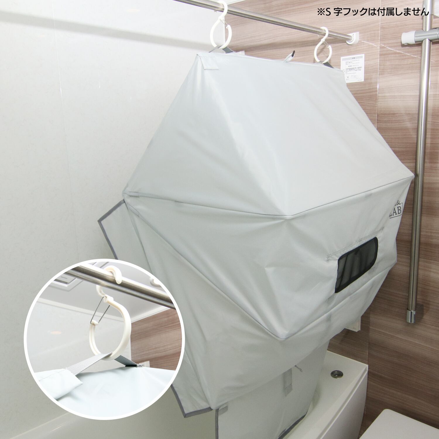 ・S字フック用の吊り下げ用ループ付き。使用後はハンガーに吊るして手軽に陰干しができます。