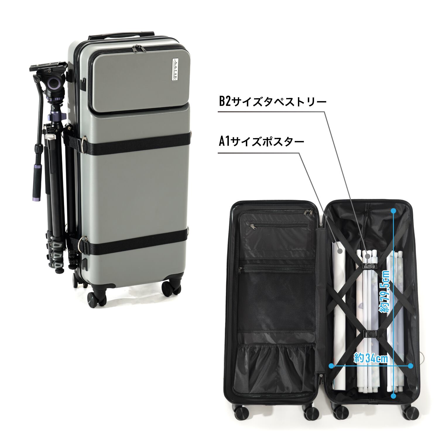 カメラ三脚やアンブレラなどの撮影機材をまとめて運搬できます。