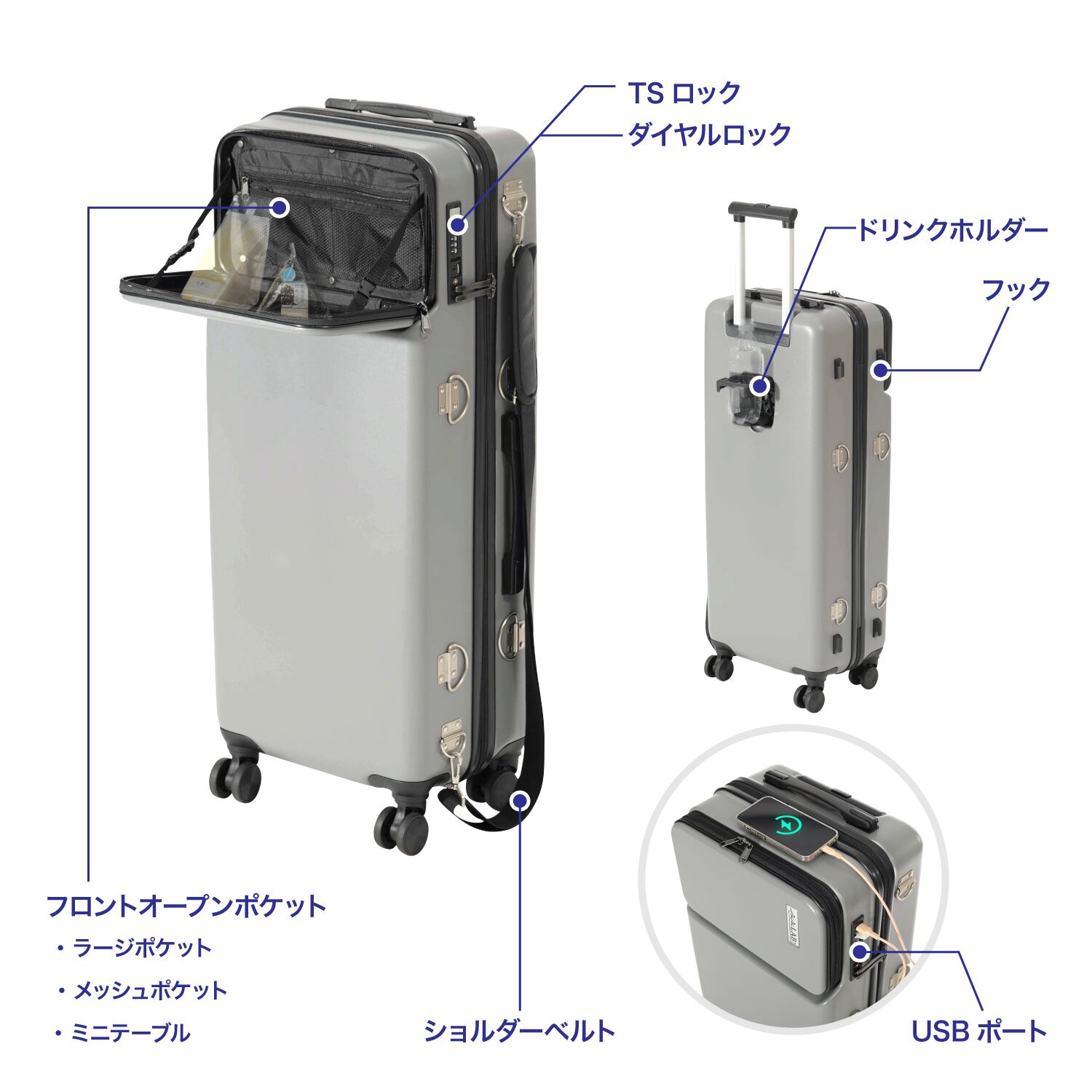 ・モバイルバッテリーが接続できるUSBケーブルとスマホなどの充電に便利なUSBポート付き。