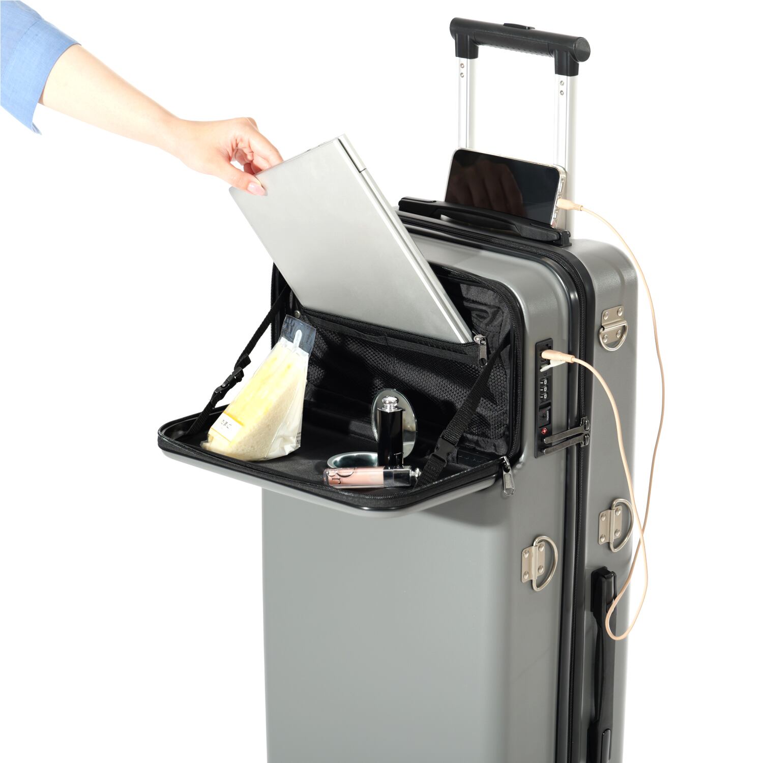 スーツケース本体を開く必要なく、いつでもサッと取り出すことが可能です。