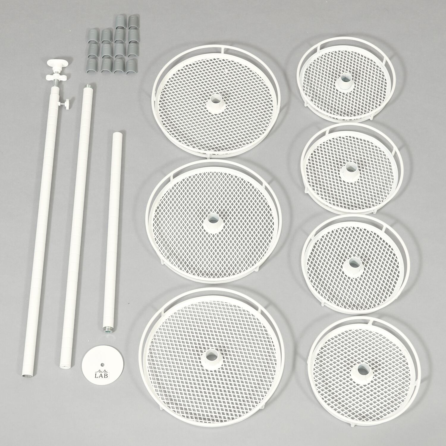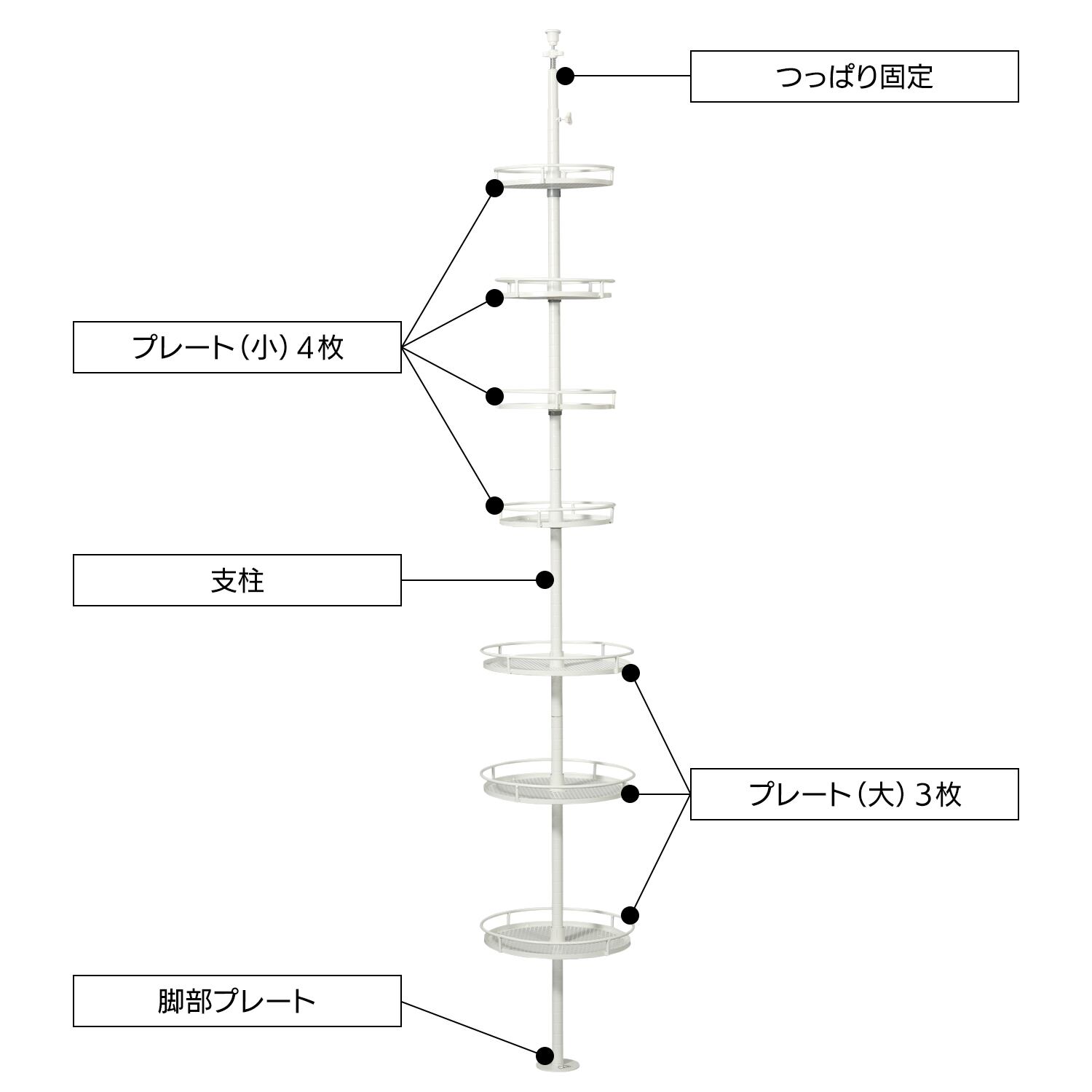 構成パーツ:つっぱり棒、プレート(大)3枚、プレート(小)4枚を組み付けて構成します。