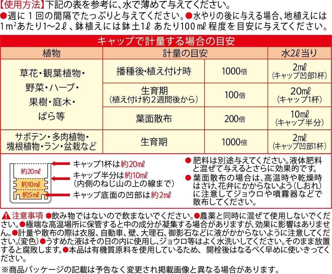 ⑤ うすめた液はその日の内に使用し、ジョウロ等はよく水洗いしてください。そのまま放置すると腐敗します。