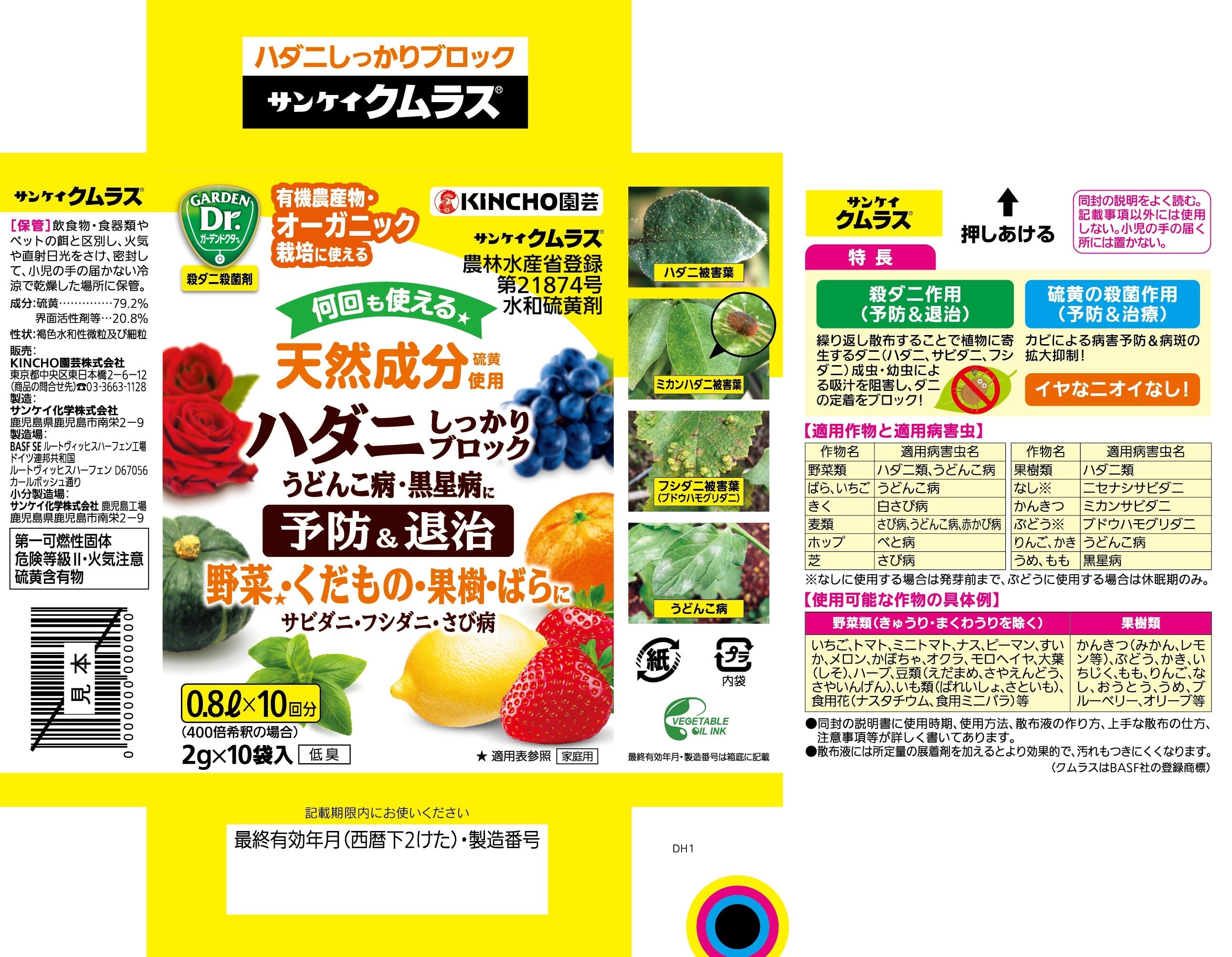 ●うり類(きゅうり、まくわうり等)など硫黄剤に弱い作物への使用はさけてください。