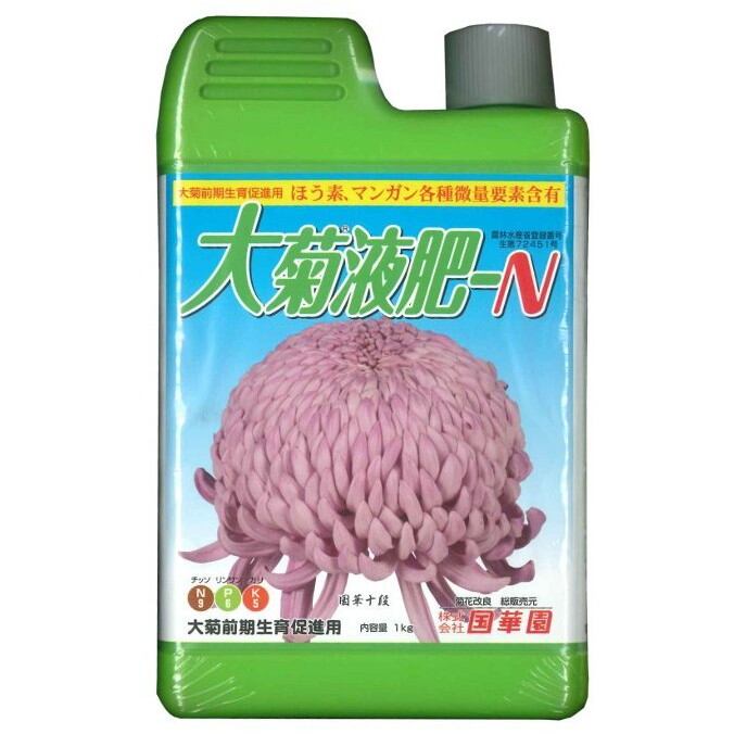 ●大菊液肥Nは窒素を多くした商品で、菊づくり栄養生育期専用液肥とし、全国各地菊品評会必勝の液肥として実証済です。