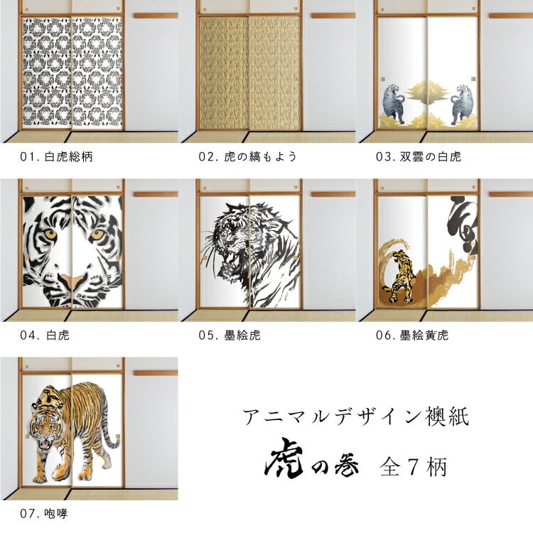 7柄)Tiger_01F 白虎総柄、Tiger_02F 虎の縞もよう、Tiger_03F 双雲の白虎、Tiger_04F 白虎、Tiger_05F 墨絵虎、Tiger_06F 墨絵黄虎、Tiger_07F 咆哮
