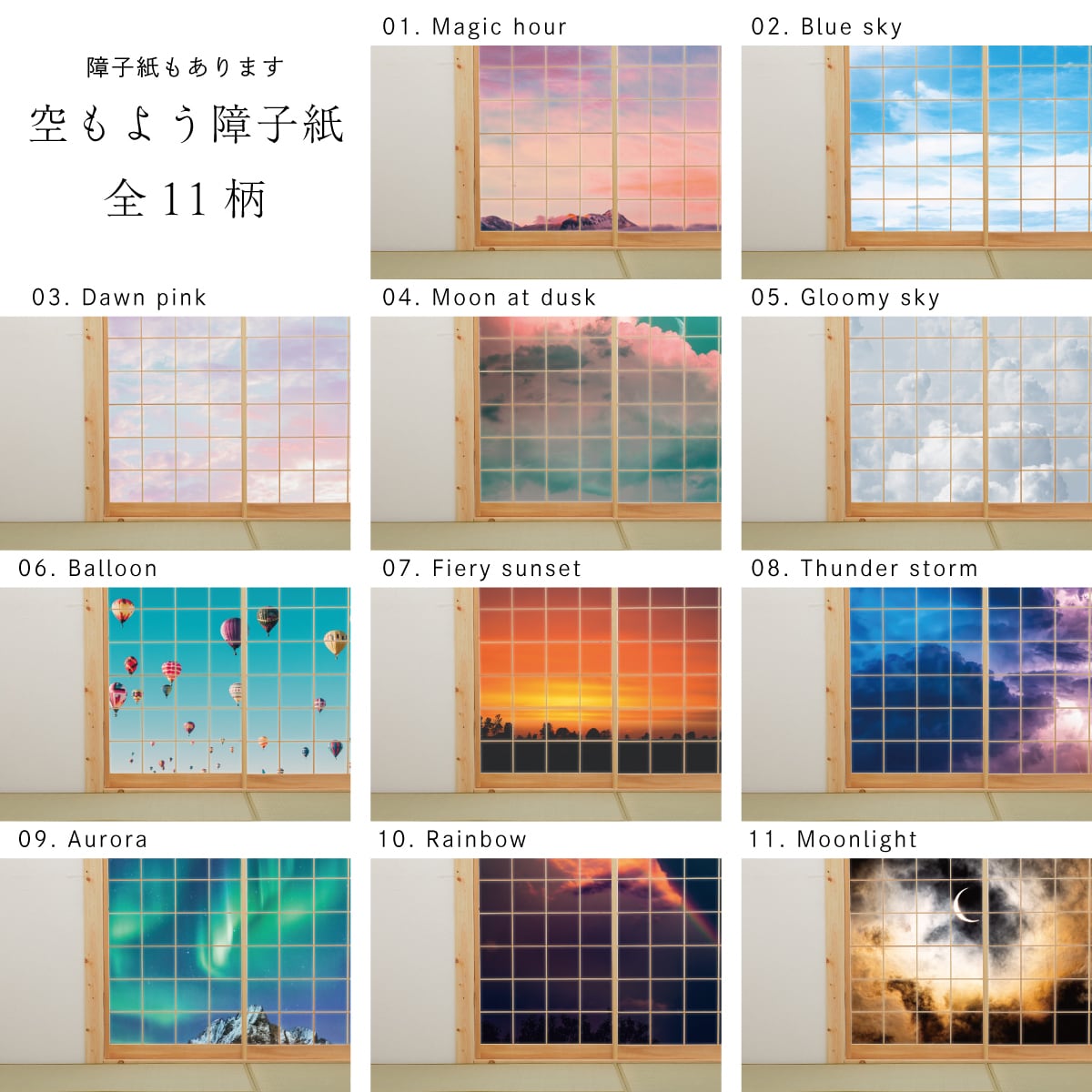 11柄)sky-01F Magic hour、sky-02F Blue sky、sky-03F Dawn pink、sky-04F Moon at dusk、sky-05F Gloomy sky、sky-06F Balloon、sky-07F Fiery sunset、sky-08F Thunder storm、sky-09F Aurora、sky-10F Rainbow、sky-11F Moonlight