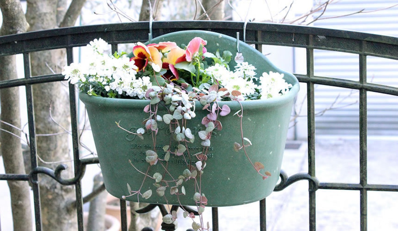 フェンスなどに掛けて使えるハンキングポットは空間を仕切る柵に彩りを与えます。