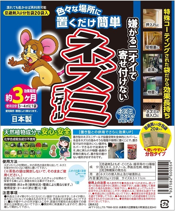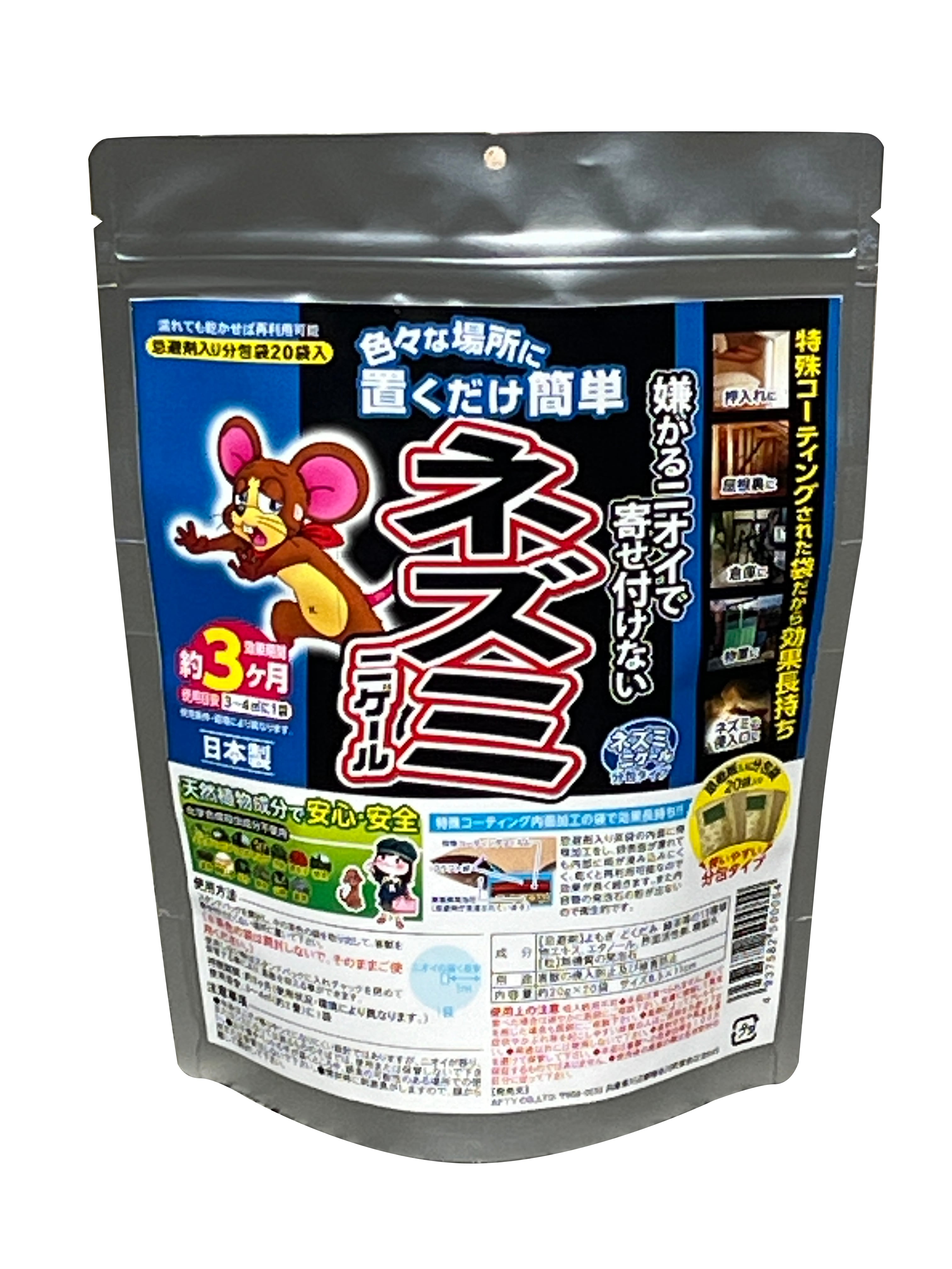 ワサビ・唐辛子の刺激臭&よもぎ・どくだみ・月桃などネズミ・不快害虫が本能的に嫌がる13種類の植物成分を配合した分包タイプ忌避剤です。